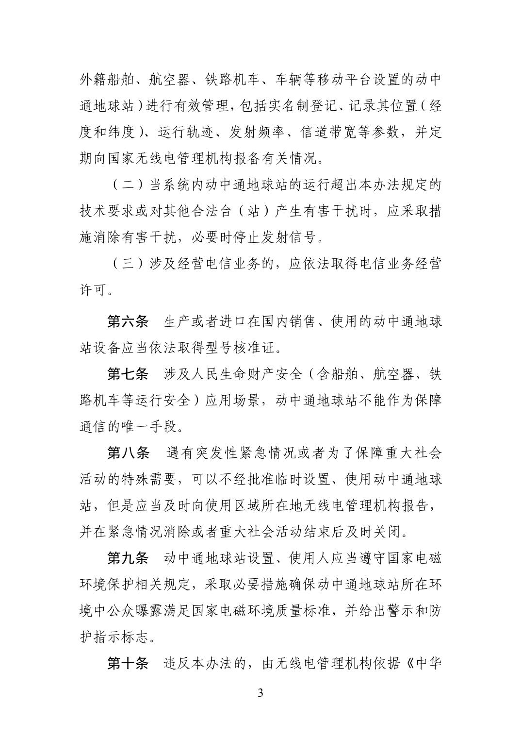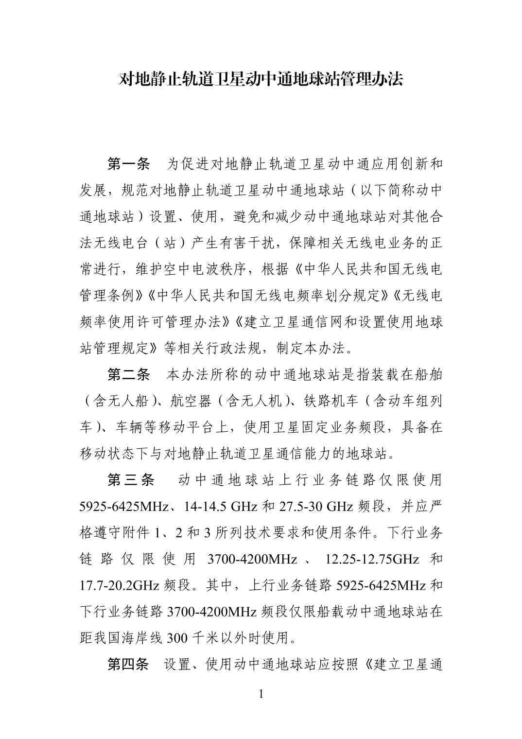 为促进对地静止轨道卫星动中通应用创新和发展,规范对地静止轨道卫星动中通地球站设置、使用,避免和减少动中通地球站对其他合法无线电台(站)产生有害干扰,保障相关无线电业务的正常进行,维护空中电波秩序,根据《中华人民共和国无线电管理条例》《中华人民共和国无线电频率划分规定》《无线电频率使用许可管理办法》《建立卫星通信网和设置使用地球站管理规定》等相关行政法规,我部制定了《对地静止轨道卫星动中通地球站管理办法》,现予发布,自印发之日起施行。