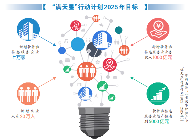 目前,中心城区各区已行动起来。如,两江新区正加快制定出台软件和信息服务业发展专项政策,拟从减租免租、技术研发创新、软件人才引育等方面给予软件企业专项扶持;渝中区已草拟了《渝中区软件和信息服务业发展“满天星”行动计划(2022—2025年)(征求意见稿)》,细化落实重庆“满天星”行动计划的政策措施;巴南区拟出台《推动软件和信息服务业发展的十条政策》《推进软件和信息服务业发展工作方案》等。